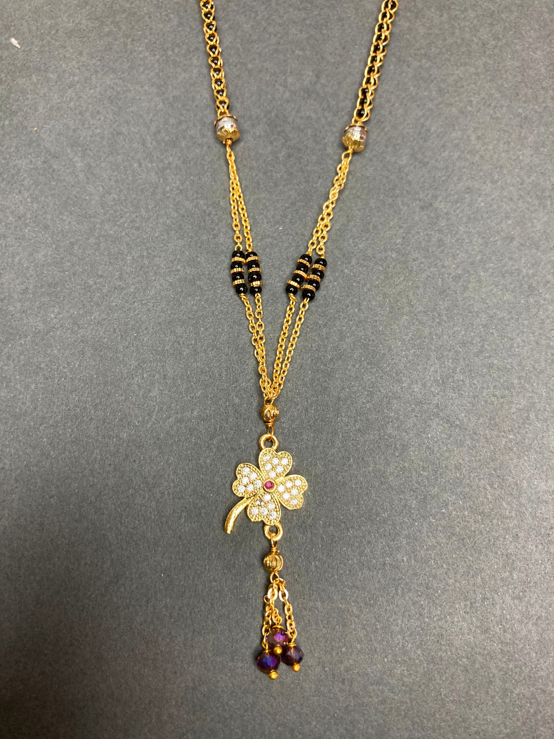 Get ready to be wowed by this mangalsutra that's anything but ordinary! It effortlessly combines tradition with a hint of glamour. Decked out with dazzling American Diamonds, it brings a trendy twist to its timeless charm. This unique piece seamlessly blends tradition and sparkle, giving you the best of both worlds – elegance and style.