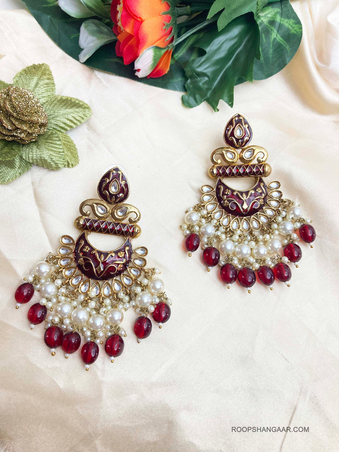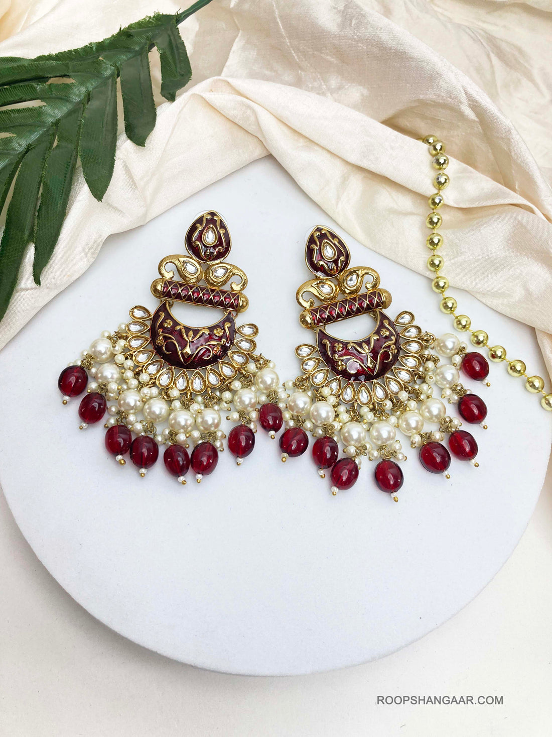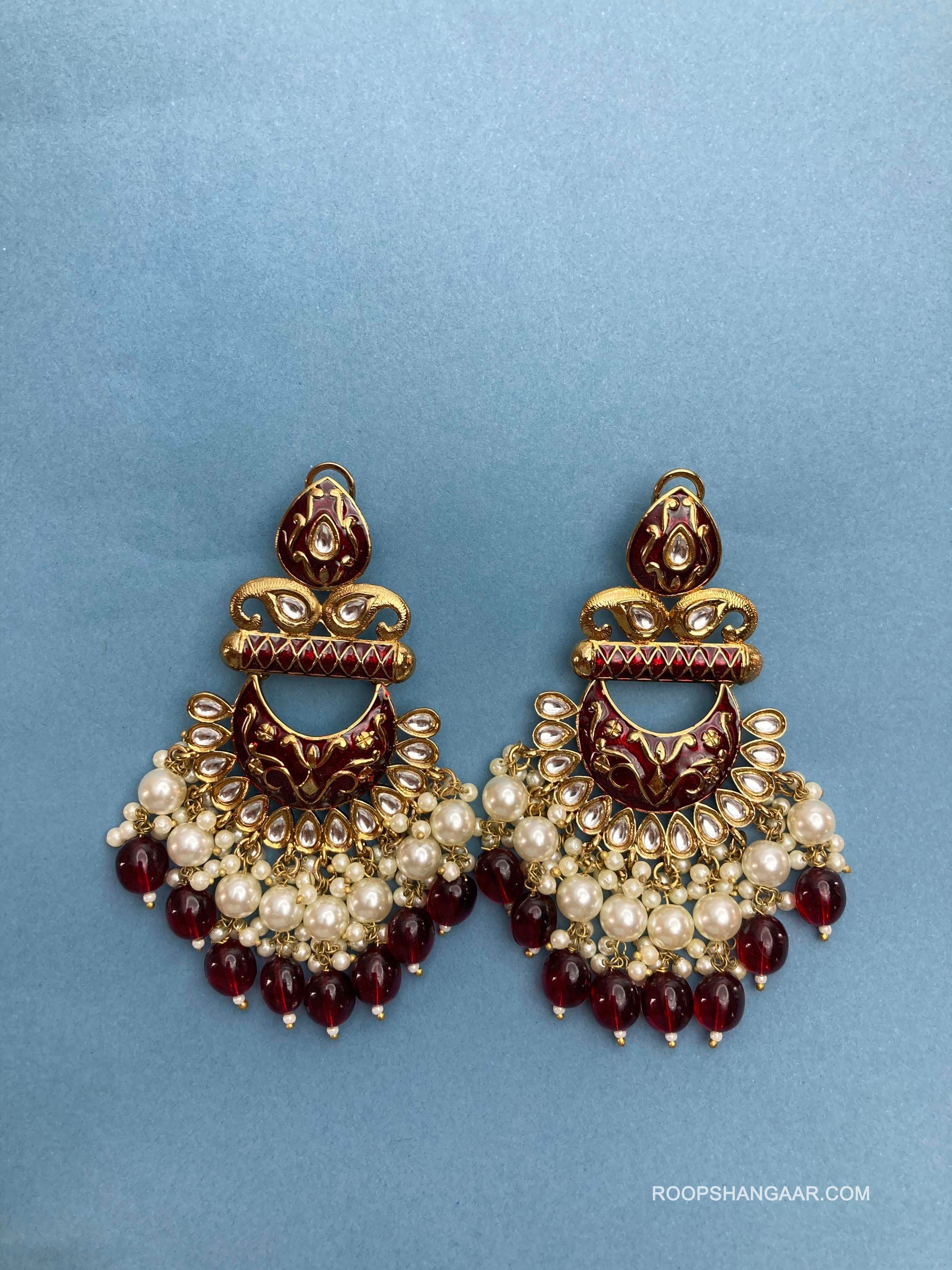 Adorn yourself with our exquisite chandbali earrings, a true testament to the blend of antique and contemporary Indian fashion. These ornate earrings, embellished with kundan and polki detailing, exude the timeless charm of bridal jewelry. Whether it's your wedding day or the vibrant haldi ceremony, these pieces add a touch of regal elegance, ensuring you stand out in bollywood-style glamour, making a bold statement on any occasion.