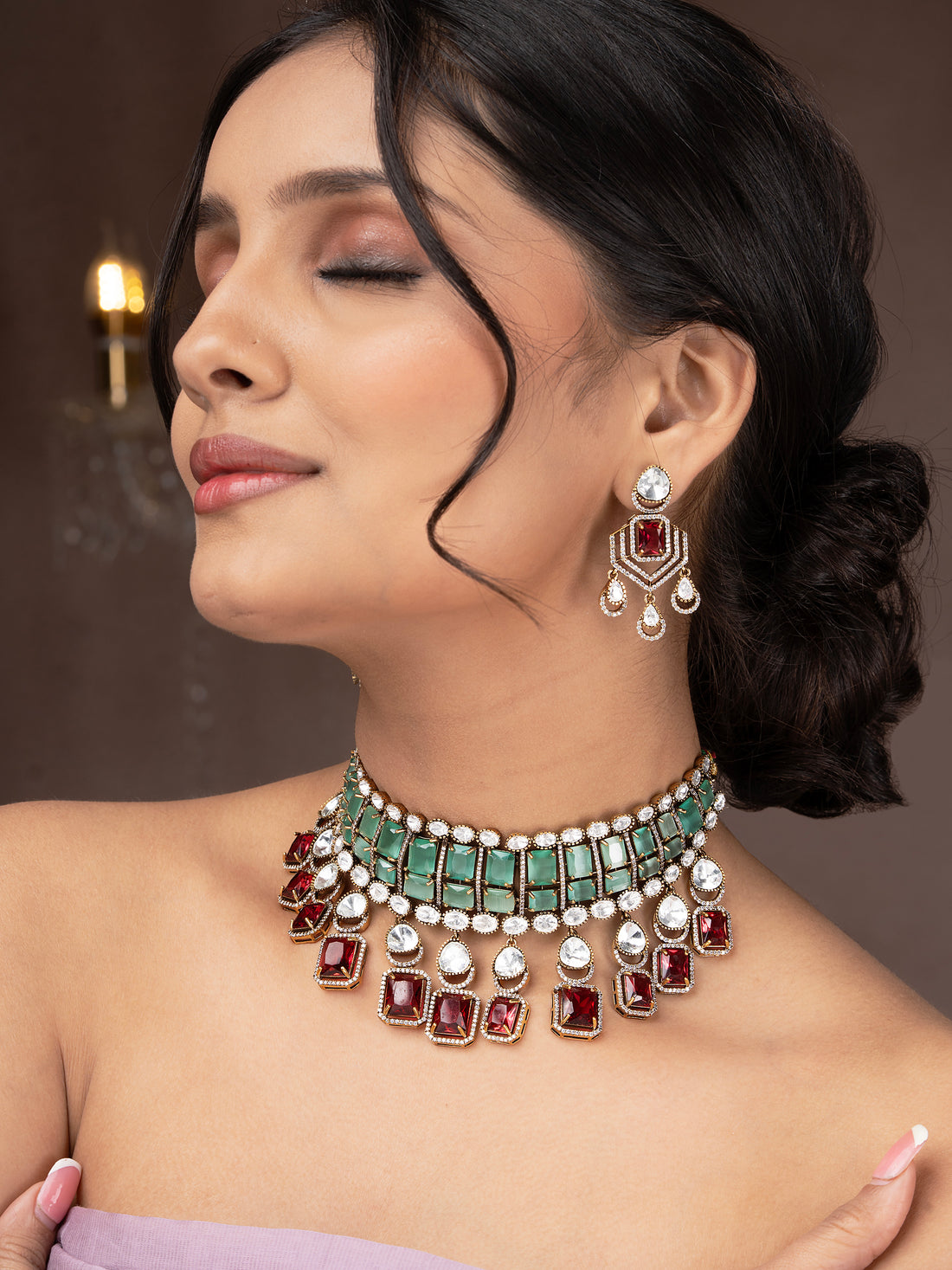 Elevate your wedding ensemble with our exquisite Mehrunisa Moissanite Necklace Set. Crafted in elegant golden-base, this stylish jewellery set is a mesmerizing masterpiece, perfect for weddings and special occasions. Make your special day even more memorable with the radiance of this exquisite diamond necklace, a true testament to the artistry of fine jewellery design.