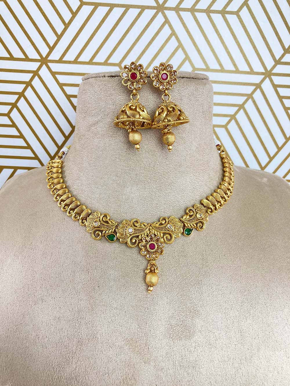 Enhance your traditional Indian attire with our stunning ethnic Kundan necklace sets. Crafted using the ancient Kundan technique, these sets showcase a beautiful combination of precious stones and intricate designs. Featuring diamonds, rubies, and emeralds set in a gold or silver base, these necklaces are held in place by delicate strips of gold or silver. Each set is adorned with exquisite enamel work, beads, and intricate details, creating a unique work of art. Perfect for weddings, festivals, and cultural events, these necklace sets effortlessly add elegance and sophistication to any outfit. Stand out from the crowd with our breathtaking ethnic Kundan necklace sets and make a captivating style statement.
