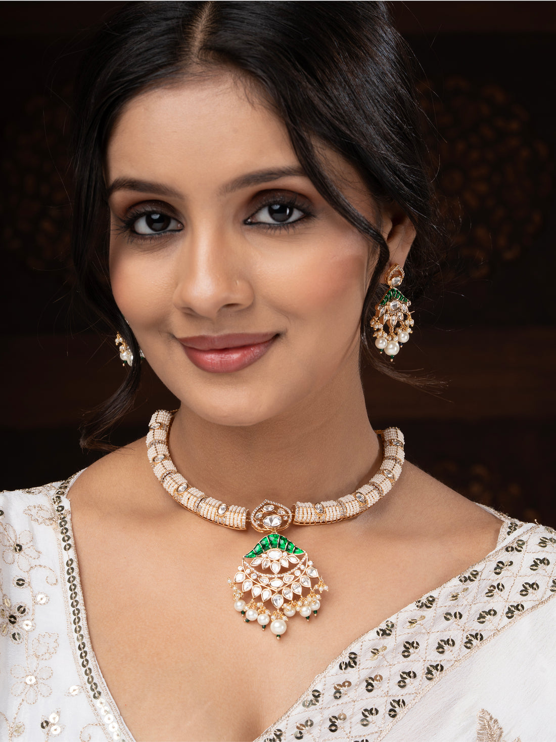 Elevate your wedding ensemble with our exquisite Pushpika Moissanite set. Crafted in elegant golden-base, this stylish jewellery set is a mesmerizing masterpiece, perfect for weddings and special occasions. Make your special day even more memorable with the radiance of this exquisite diamond necklace, a true testament to the artistry of fine jewellery design.