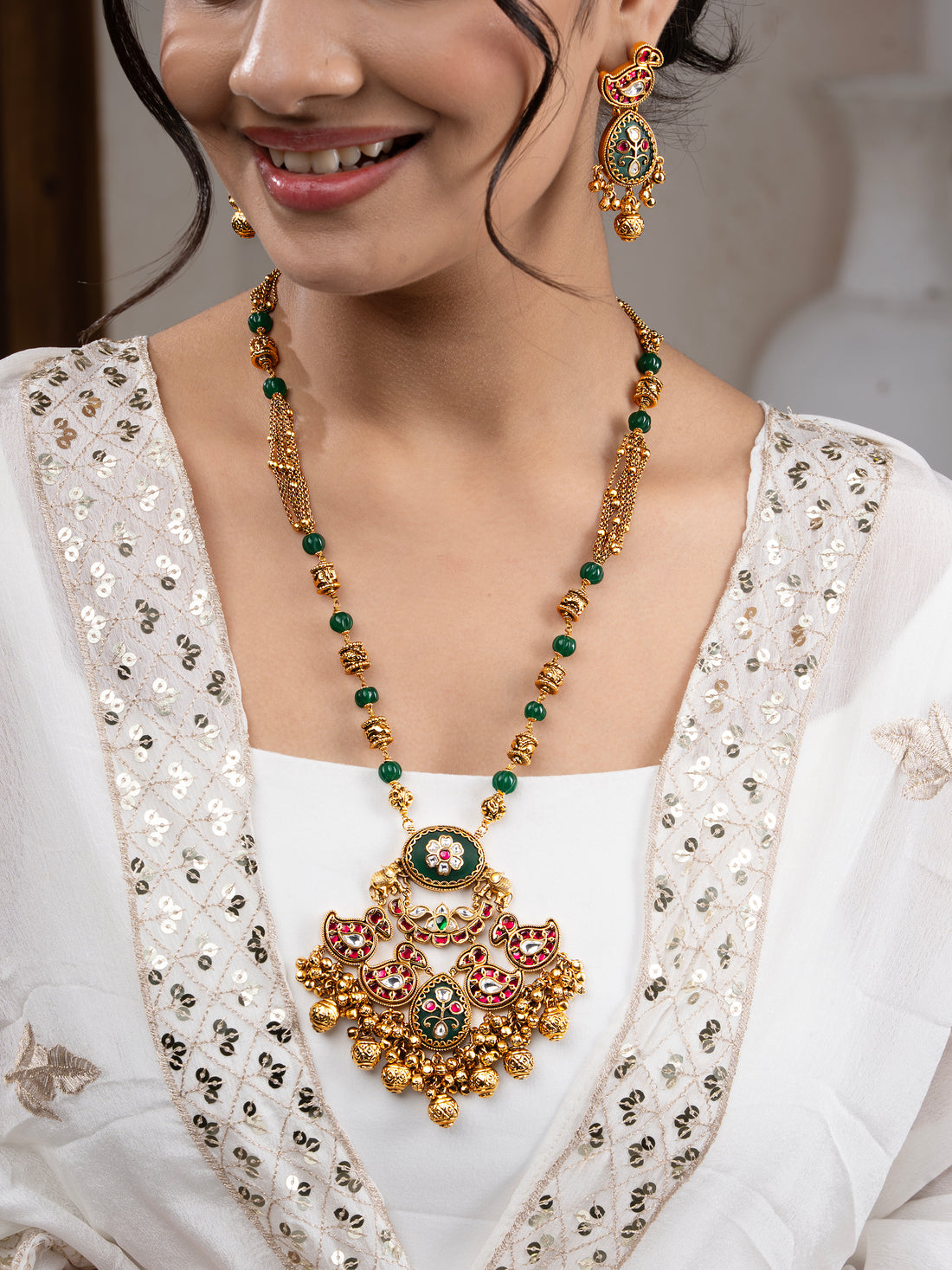 Elevate your wedding ensemble with our exquisite Tarini Heritage Long set. Crafted in elegant golden-base, this stylish jewellery set is a mesmerizing masterpiece, perfect for weddings and special occasions. Make your special day even more memorable with the radiance of this exquisite diamond necklace, a true testament to the artistry of fine jewellery design.